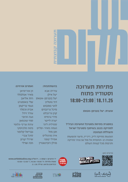 Participating artists: Irit Abba, Yael Boverman-Attas, Assaf Cohen, Emily Cooper, Miri Garmizo, Loti Gombosh, David Gotliv, Caron Greenblatt, Michal Greenboim, Yael Ilan, Yaara Leiter, Cecilia Lind, Aya Margulis, Chanan Mazal, Shani Reches, Marleene Rubenstein.